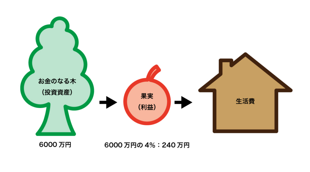 - この6000万円を運用しながら毎年4%(=240万円)を引き出す