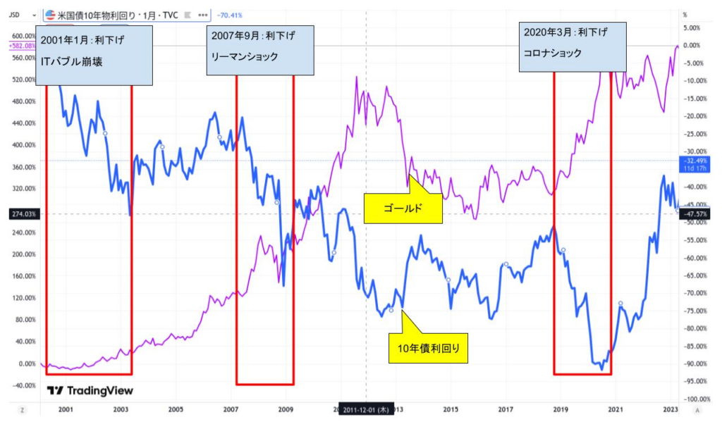 下記の図でわかるとおり、利下げが始まり10年債利回りが低下すると同時にゴールドの価格は上昇しています。