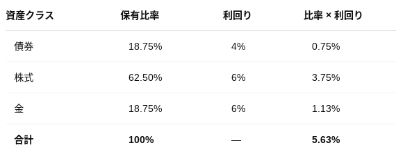 現金を除く債券、株式、金の「比率✕利回りを合算」すると下記表のとおり5.63%となります。トリニティスタディの株50/債券50の5.5%以上の利回りを確保できています。※ただし、現金を除いた資産の4%で生活できるように設計しています。