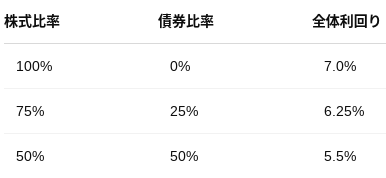 トリニティスタディでは下記のような比率で株、債券を保有しています。例えば株式50:債券50の場合は、全体利回りは5.5%です。※株(S&P500)利回り7%、債券利回り4%としています。