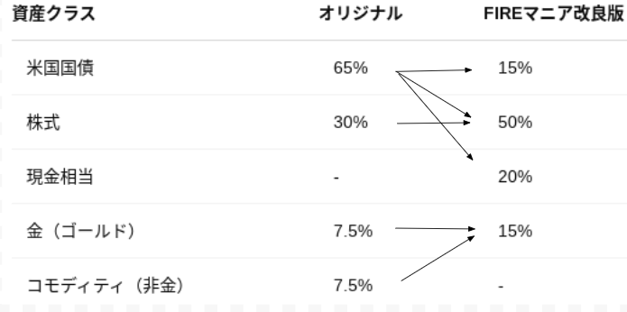 為替リスクを考慮し、米国債などの外国債券の比率をオリジナルの戦略より低く設定し、その分を株式や現金へシフトしています。株式にシフトし過ぎると、株価暴落で破綻するリスクがあります。現金にシフトし過ぎると4%ルールを維持できないリスクがあります。それぞれへのシフト割合は下記で説明しています。