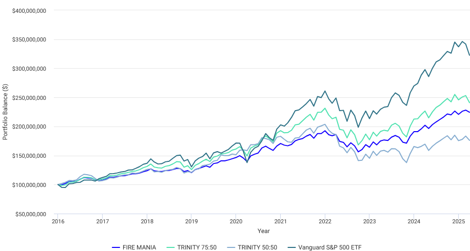 - FIRE MANIAのグラフはSP500:50%、債券:15%、金:15%、現金:20%で設定。現金は除くという考え方もあるが、現金もリバランスに含めたいためこの構成としている。