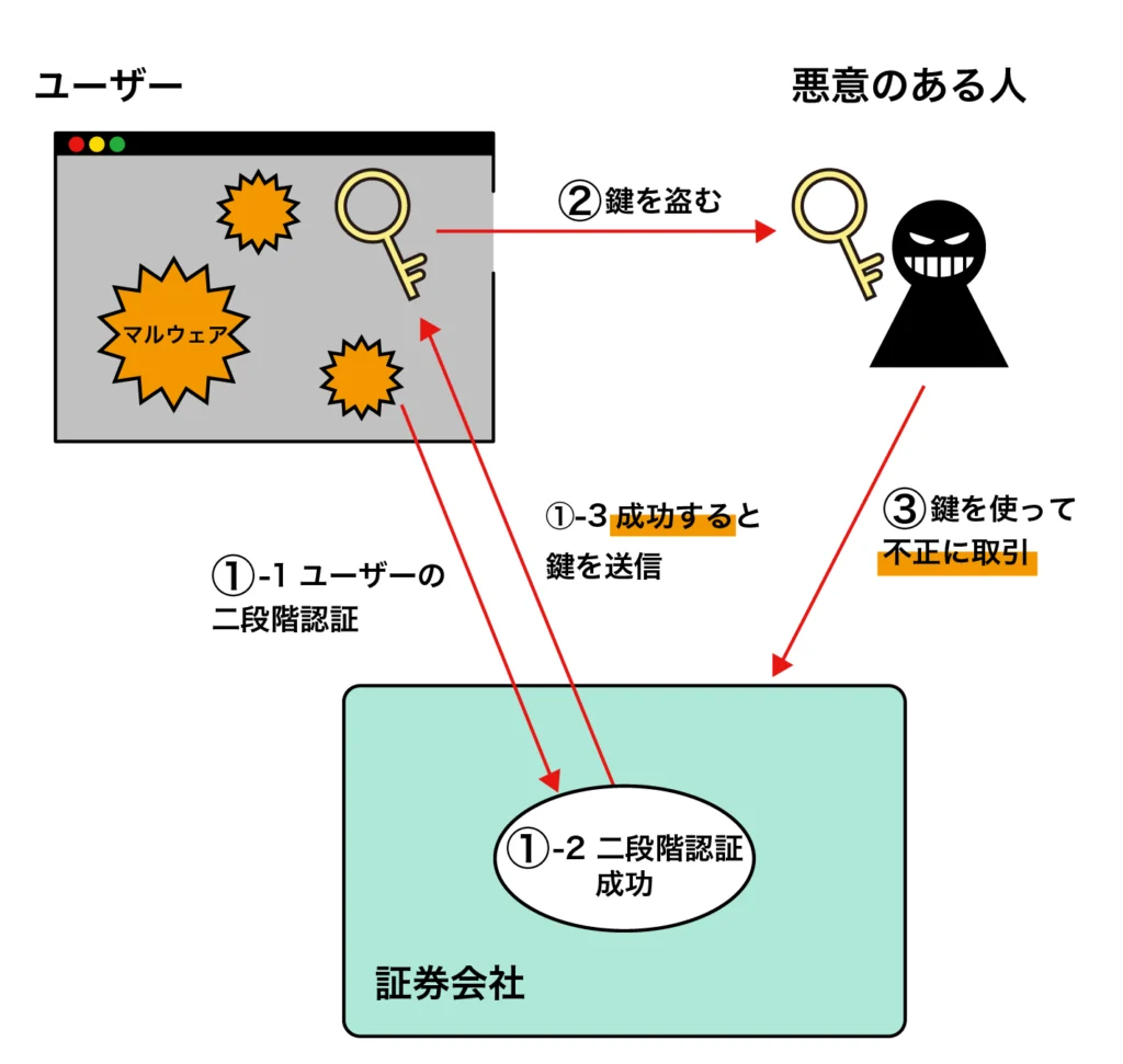 証券会社のWEBサイトにセキュリティホールがあると、鍵を盗む不正プログラムコードをブラウザに注入されます。